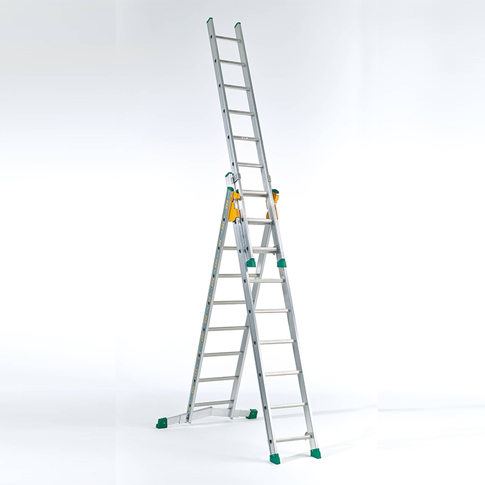 Escalera de aluminio compuesto por 3 tramos de 8 escalones cada uno, tiene una base muy estable y antideslizante.